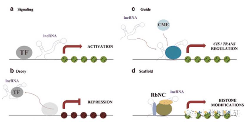 首先我们知道lncRNA的作用模式比microRNA复杂的多(这也是我们选lncRNA来介绍分子机制研究模式的原因),microRNA作用方式是通过结合mRNA来抑制翻译或者促进降解实现的,发生在转录后水平;但是lncRNA就太复杂了,因此有关于lncRNA作用模式的多种说法,比如顺式(cis)和反式(trans)之分,比如Signal,Decoy,Duide,Scaffold,也可以根据lncRNA与不同的分子分为DNA、RNA和蛋白,总体上包括了转录和转录后水平。