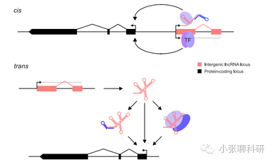 上图是lncRNA作用机制的说明:顺式(cis)和反式(trans)
