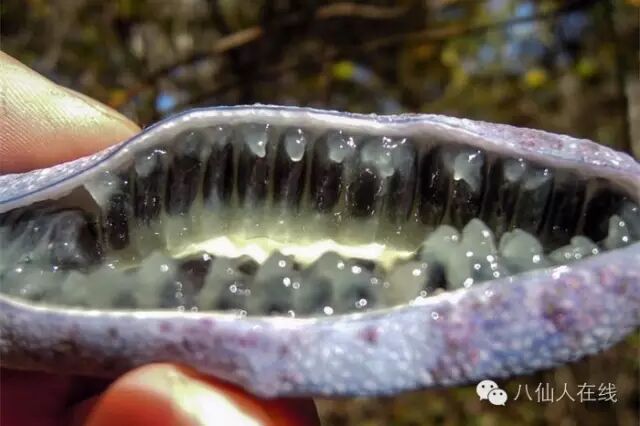 它皮厚,肉质呈晶莹透明的白色,里面包含有黑籽,剥开后即可吸食,非常可口。