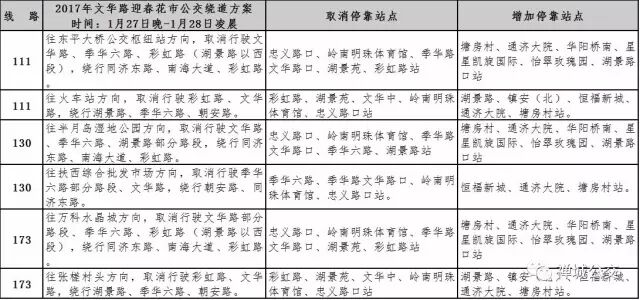 另外,根据往年情况,1月27日除夕夜当晚,季华六路与文华路交叉口也会实施交通管制,公交130线也需实施临时绕行。由此引起的不便,敬请广大市民谅解。上述绕行的线路,在道路恢复通行后将马上恢复原线行驶。