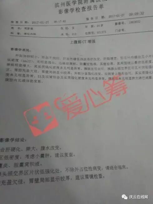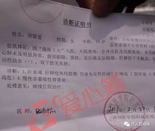 我妈妈叫郑新爱山东省德州市庆云县常家镇中石关堂村人。于2016年12月28日查出肝病接着住院治疗,到2017年1月20日在病房里突然吐血。检查出肝硬化衰竭进出重病医学科,今年44岁。现在滨州附属医院救治。现在已经花费8万多。花光家里的所有积蓄。已向亲戚朋友借4万多元。无经济来源无力支付在重病医学科一天15000元多的治疗费用。情况万分紧急。急需医费治疗。希望爱心人士伸手相助救救我的妈妈。万分感谢!联系电话:15165983873