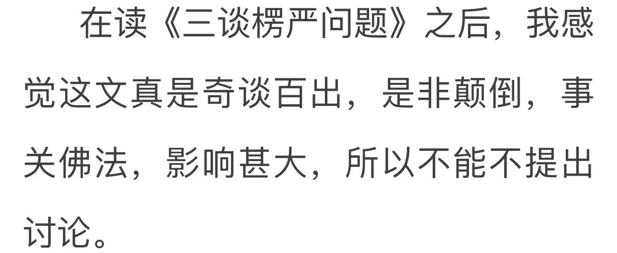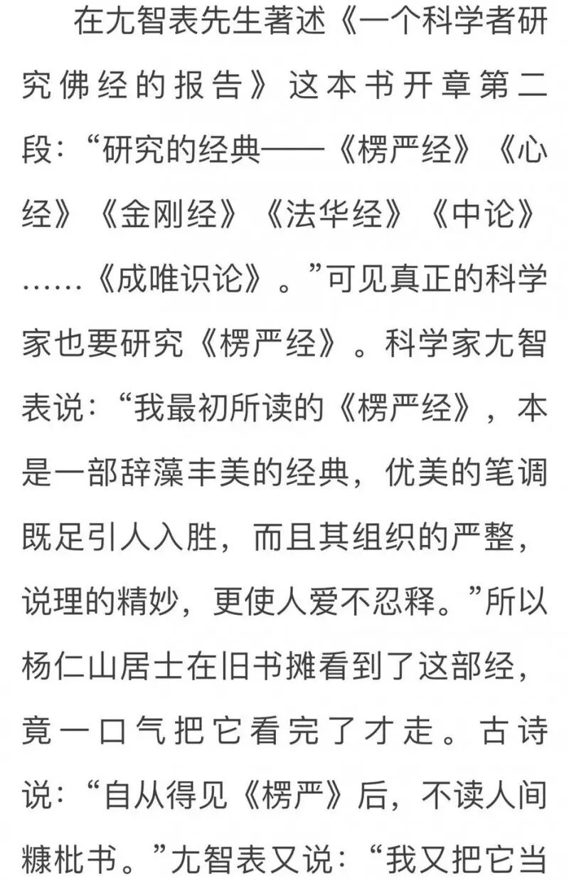 《楞严》自唐,惟悫大师,始作疏解,相沿至今,已有数十百家,孰不谓深契佛心,得其骨髓。古今读《楞严》而开悟者,诚不胜其数,如玄沙、长水、黄龙、蕅益诸师,莫不因《楞严》而有悟。宗门诸师,出词、吐气、接化学人,其语意亦多来自《楞严》。所以通智禅师云:“《楞严》一经,乃性宗之秘典,括十二部而无遗,性修圆显,宗教极唱,不可思议之法宝也。”蕅益大师亦云:“《楞严》是诚一代时教之精髓,成佛作祖之秘要,无上圆顿之旨归,三根普被之方便,超权小之殊胜法门,摧魔外道之实相正印也。”昔学者有“自从一读楞严后,不看人间糟粕书。”之言。古德非彻悟心地者,便是大文豪,吕澄何可步人后尘,摘鞋尚难合格,而论“楞严百伪”,岂非班门弄斧乎!