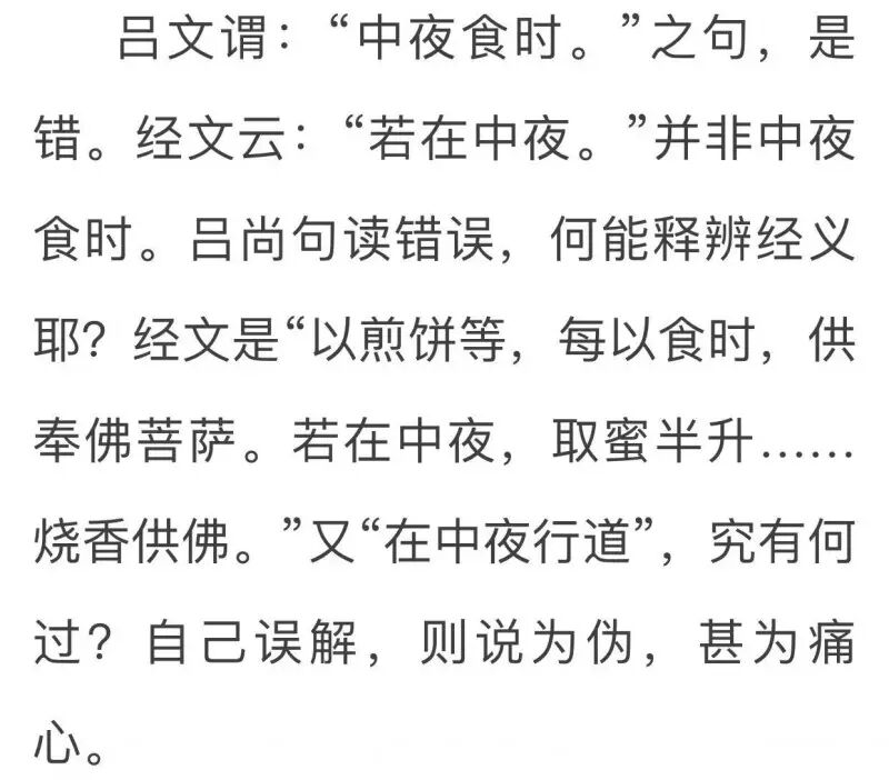 四戒,即是戒杀、盗、淫、妄,是大小乘共修之四根本戒。不过,大乘以慈悲为本,故以戒杀为先;小乘重视了生死,故以戒淫为先。淫为生死之根本,故先说戒淫,岂可说“全同小乘”?吕文谓:“杀戒之中,佛本说三净肉,而撰为五比丘食有五。”请问经文何处有说“五比丘食有五”耶?经文卷六云:“我令比丘食五净肉。”“五净肉”是三净肉加上自死、鸟残,说三净或五净究竟有何过?佛说:“婆罗门地,草菜不生,故方便准食五净肉。”吕文谓:“据《涅槃经》说比丘不服奶酪醍醐是魔说。”今《楞严》谓:“若诸比丘,不服东方丝绵绢帛,及此土靴履裘毳,奶酪醍醐,如是比丘,于世真脱。”按《涅槃经》【注十九】谓:“我唯听食五种牛味,及油蜜听著屣憍奢耶衣等。”佛说听食五种牛味等是先说,今《楞严经》是严格说。不但不食众生肉,即众生身份所出之奶酪亦不食,岂得说此为魔说?《大智度论》【注二十】:“有人虽节量食,过中饮浆则心乐著,求种种浆、果浆、蜜浆等,求欲无厌不能一心修习善法。”故《楞严》说:“不服奶酪等。”是令一心修习。
