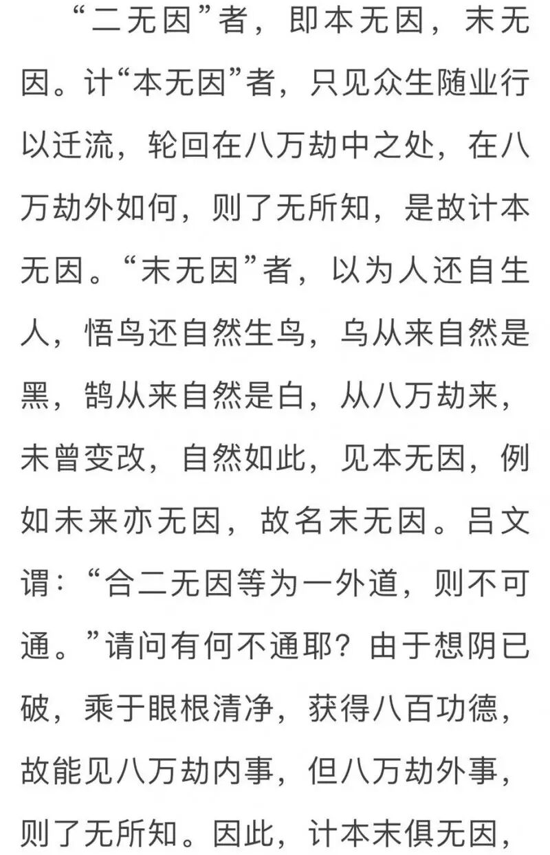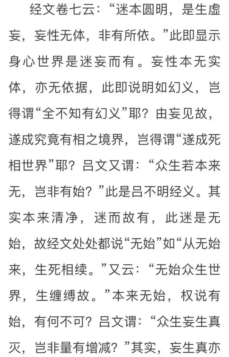 佛法有名“自性涅槃”,即可有名“自性菩提”,因涅槃菩提并非二法。涅槃是心体,菩提是心光,心体、心光同是一心。岂得云:“按佛法有自性涅槃而无自性菩提”?据《行愿品》偈颂云:“我昔所造诸恶业,皆由无始贪瞋痴。”有“无始”二字。又《智论》【注十】亦有释无始。《心地观经》【注十一】云:“有情轮转生六道,犹如车轮无始终。”“无始”二字,遍于众经。何得云:“无始之言,实为臆造。”吕文谓:“元清净体,应指法性,法性为法所依,非能生法。”既然说:“法性为法所依。”即如母亲为儿女所依,亦即可说母亲能生儿女。今说:“能生诸缘,出于杜撰。”是吕之迷糊。