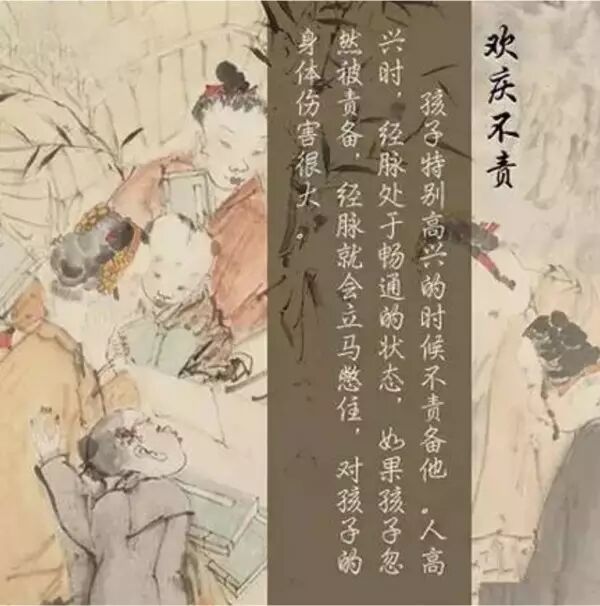 孩子特别高兴的时候不要责备他。人高兴时,经脉处于畅通的状态,如果孩子忽然被责备,经脉就会立马憋住,对孩子的身体伤害很大。