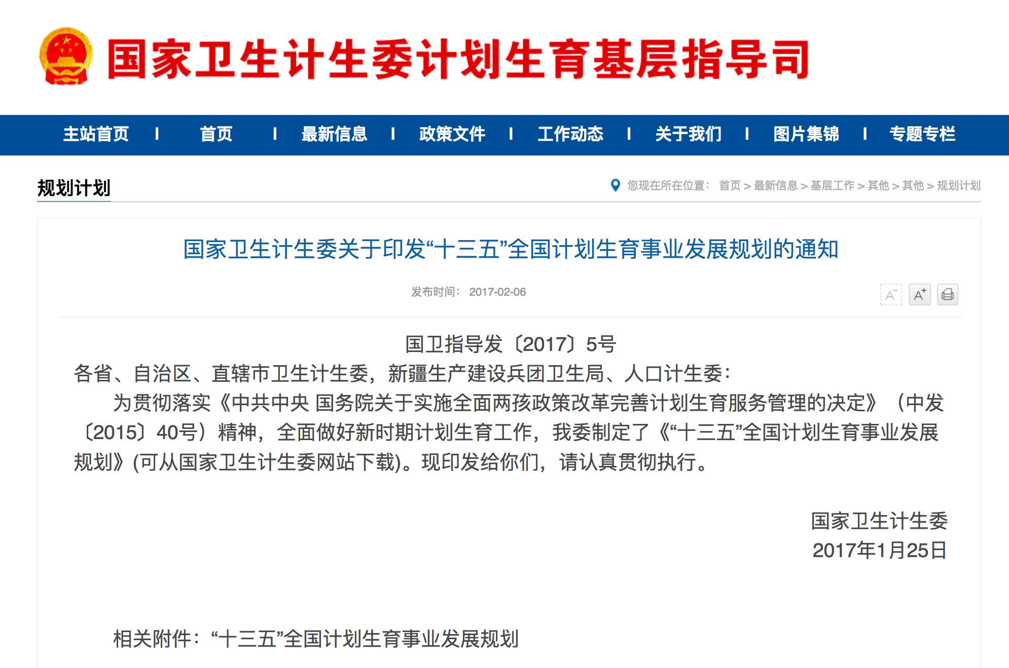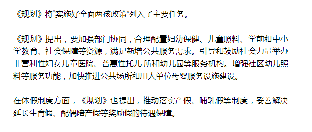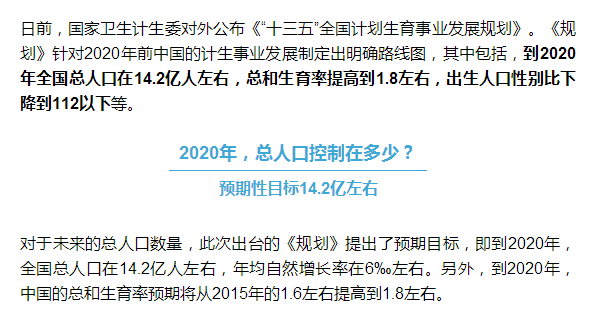 此外,《规划》中还特别提出,将加强再生育技术服务保障,鼓励全面两孩政策目标人群较为集中的地区设置再生育或高危孕产妇门诊。