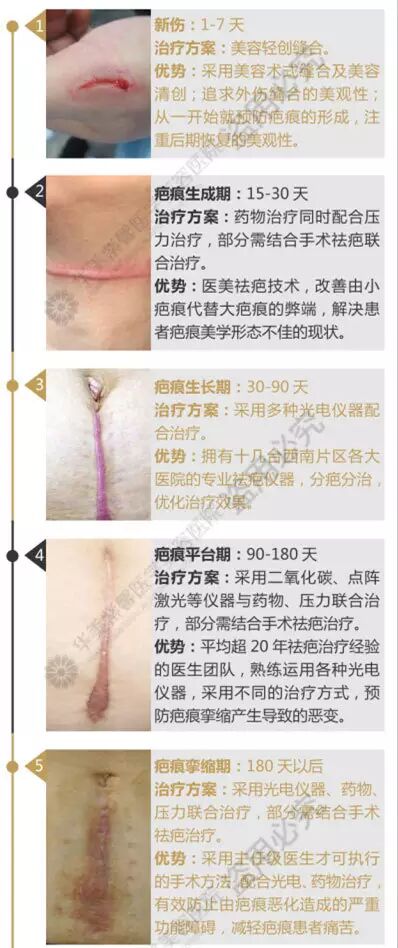 从新伤期—疤痕生成期—疤痕生长期—疤痕平台期—疤痕挛缩期进行干预管理,个性化定制祛疤方案。我院院长杨力教授和技术院长刘会省,分别作为疤痕学教科书《新编疤痕学》和《新编皮肤软组织扩张术》的编者,在烧、创伤后遗畸形矫正方面造诣深厚。由他们带领的华美专业祛疤医生团队,积累了大量的疤痕治疗临床经验。重度疤痕治疗必须由三甲医院整形外科进修一年以上的医生才可进行手术操作,而我院疤痕管理干预的所有医生,其从业背景均有三甲医院整形外科进修5年以上的丰富临床经验。华美紫馨采用美容清创及美容术式缝合处理伤口,从一开始便预防疤痕形成,帮助疤痕恢复的同时,降低疤痕不美观的情况发生。