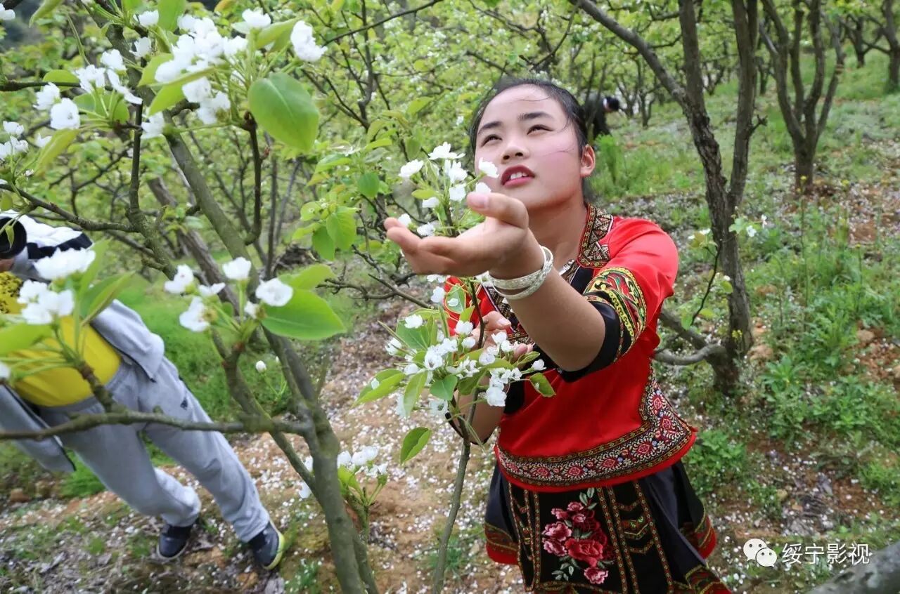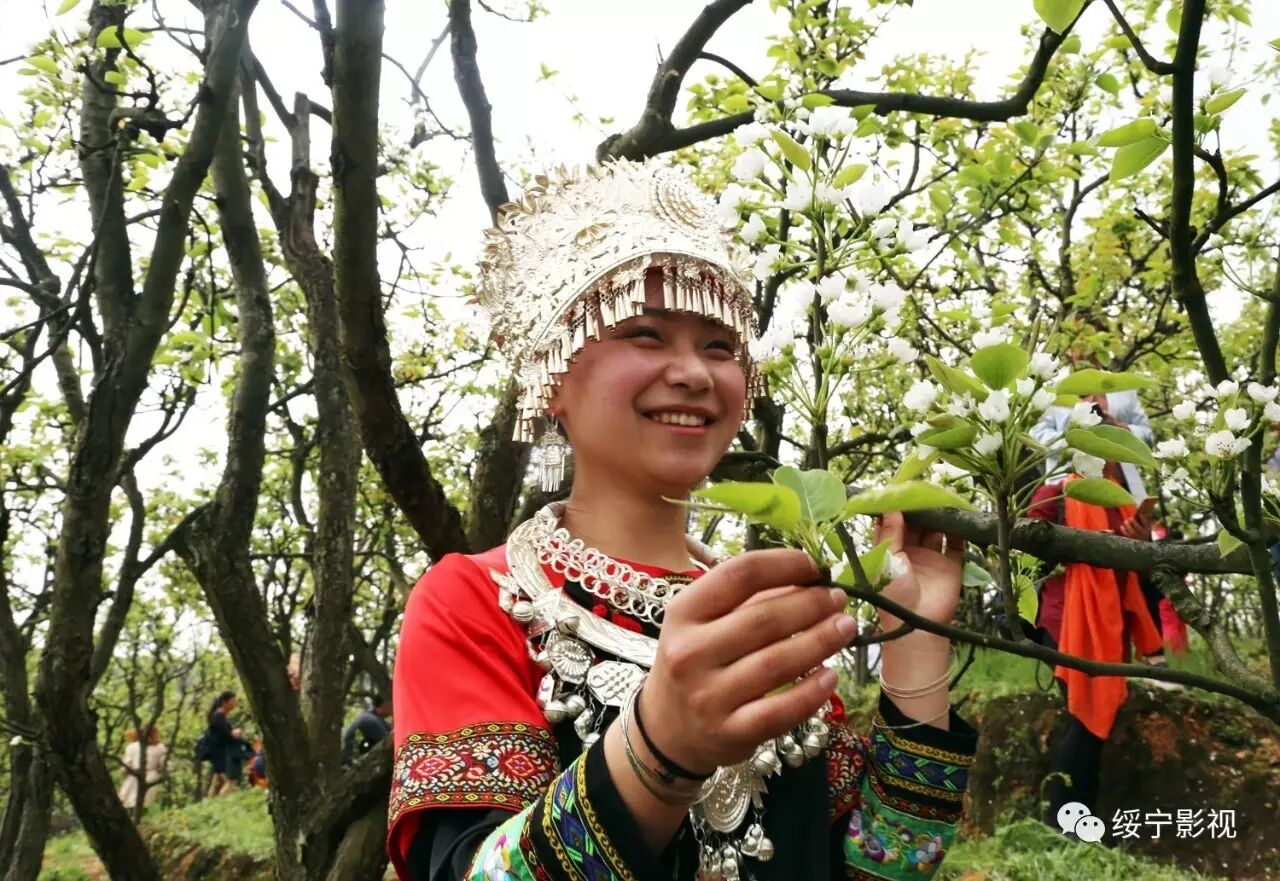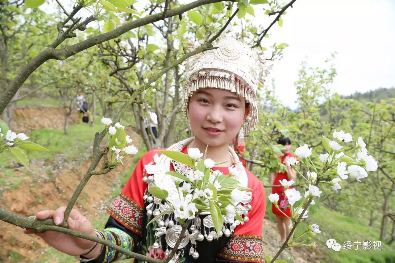 梨花园里春光明媚,绥宁县职业中专的美女帅哥们身着各式各样原创的民族服装行走在梨树间,给绿叶、白花抹上了色彩缤纷的颜色,煞是好看!