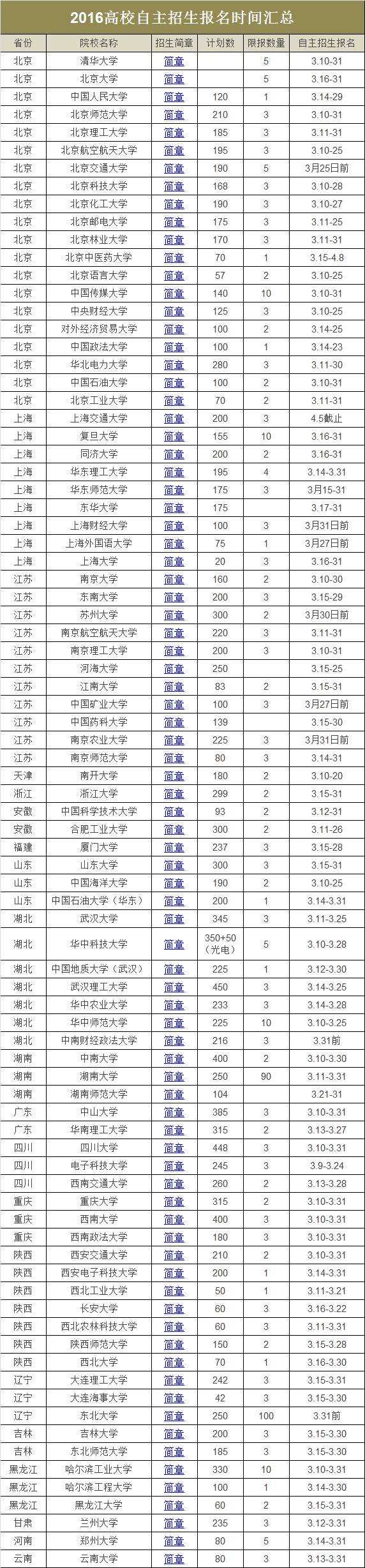 备注:以上为2016年高校自主招生报名时间,仅供参考,最终以2017年高校公布招生简章为准。