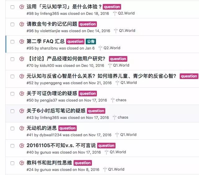 部落的卡片提交,甚至提问,都要在黑客云集的开源社区 Github 上完成。有疑问?不在同步聊天工具中灌水,而是使用开智优雅的黑客提问模板,提问前,要自己做足了功课,说明自己的操作环境,做了哪些尝试,需要获得的帮助,发 Issues 向大家求助。获得帮助后,总结问题的解决方案,并关闭 Issues,形成信息闭环。