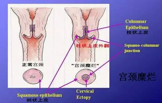 从医学上来说,女性宫颈管内的柱状上皮外翻,替代宫颈鳞状上皮,医生在检查时,会发现宫颈局部充血呈现红色,就称其为 “宫颈糜烂”。