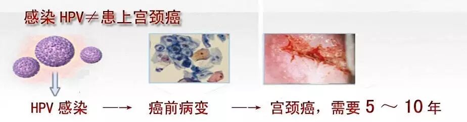 研究证实,感染HPV后,大多数女性的免疫系统可以把进入体内的HPV清除。只有 少数女性由于无法消灭进入体内的HPV,造成HPV持续感染,才有可能引起宫颈癌前病变。其中有部分患者会进一步发展成为宫颈癌,这一过程约5到10年。