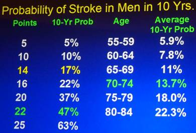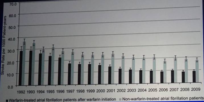 在Framingham卒中危险因素中,房颤是极其重要的一个。房颤引发的卒中70%是致死性或严重卒中。房颤的危险因素与多个Framingham危险因素重合,如年龄、血压、降压治疗、糖尿病、吸烟等。华法林抗凝治疗可预防68%的卒中,因此也是最有效的卒中预防方法。接受华法林抗凝治疗的房颤患者,其缺血性卒中的风险显著低于未接受华法林的房颤患者。