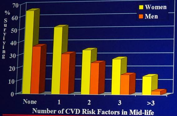 另一项探讨中年CVD危险因素与高龄(85岁)生存率关系的FHS结果显示,合并中年CVD危险因素的情况对生存率影响很大,合并危险因素越少,活到85岁的几率越大。因此,年龄作为CVD危险因素之一,似乎是可以“调整”的。