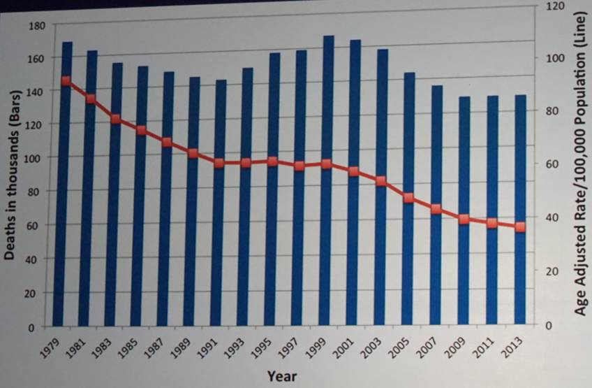 图1. 1979~2013年美国卒中死亡情况变化。红线反映年龄标化死亡率趋势。