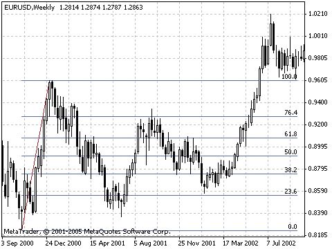 例如从最低点反向到最高点线上的两个端点画出的。然后画出9条水平线,与斐波纳契水平:0.0%、23.6%、38.2%、50%、61.8%、100%、161.8%、261.8%和423.6%与趋势线交叉。在线有重大的上升或下降时,价格常常会回到它们以前的水平纠正他们最初动态一些基本的部分(有时候是全部地)。在这么个相互作用的动向中,斐波纳契回撤线价格常常与支撑点/阻力点处同一水平或者上下于它们的附近。