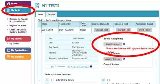 成绩出来之前添加送分学校,进入在线账户选择“My Test”进行操作。图示如下: