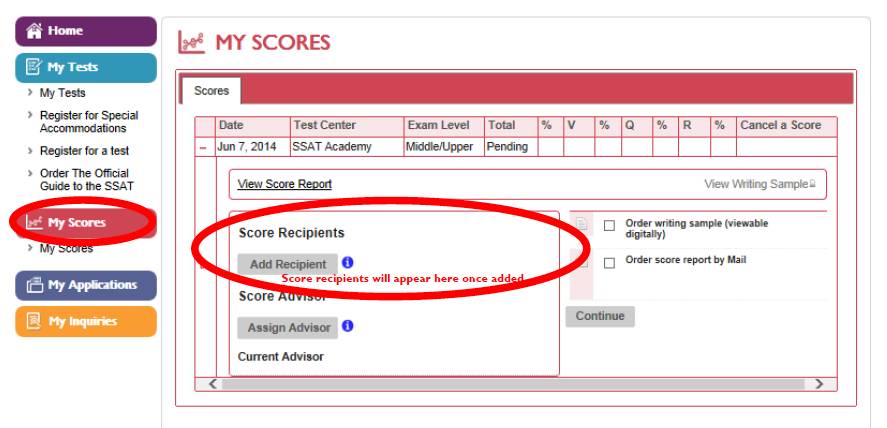 成绩出来之后添加送分学校,则进入在线账户选择“My Scores我的分数”进行操作。图示如下: