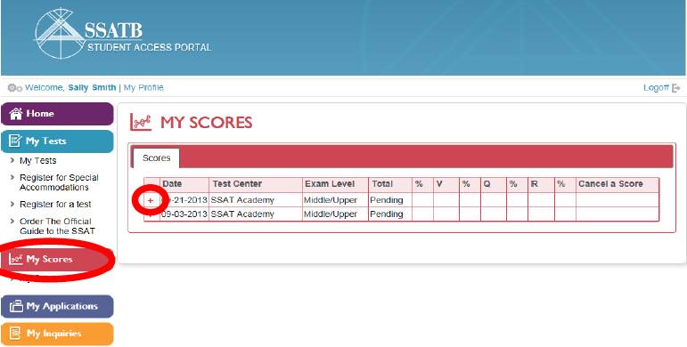 选择“My Scores”,在你要查询的考试日期前面点击“+”;