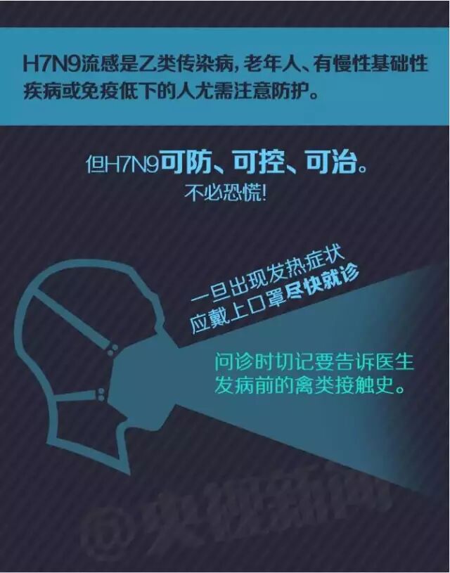 H7N9是乙类传染病,老年人和免疫力低下群人被感染的几率更高,要注意防护。虽然临床症状类流感,但一旦出现发热症状,请戴上口罩尽快就诊。一定要告诉医生发病前的禽类接触史!切记!