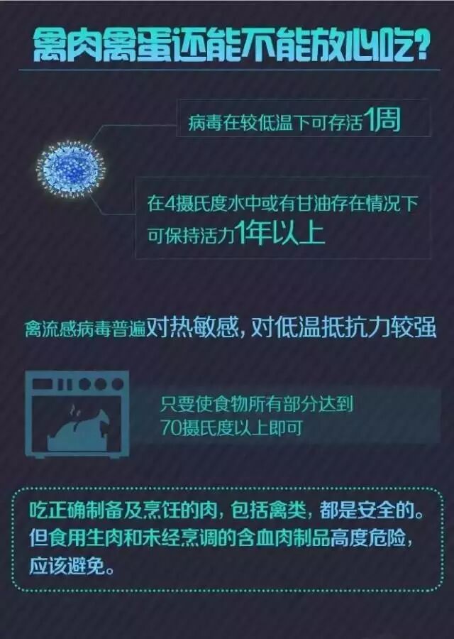 65℃加热30分钟或煮沸(100℃)2分钟以上可杀死H7N9禽流感病毒,所以,完全熟透的家禽和禽蛋类食品是可以食用的,但还是要提醒爱吃溏心蛋的朋友,未全部熟透的糖心蛋还是少吃为妙。