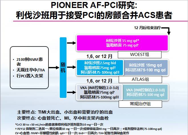 研究的主要终点是心肌梗死溶栓治疗(TIMI)大出血、需要治疗的出血和小出血;次要终点为心血管死亡、心梗、卒中和支架内血栓形成。PIONEER AF-PCI研究的三组设计拟对利伐沙班应用于行PCI的AF患者进行评价,此项特殊研究将在目前缺少数据的相关领域为临床医生提供更多的指导。