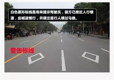 3、警告标线:促使车辆驾驶人及行人了解道路上的特殊情况,提高警觉,准备防范应变措施的标线。