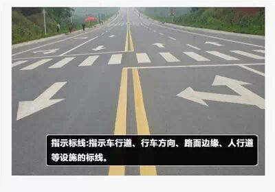 1、指示标线:指示车行道、行车方向、路面边缘、人行道等设施的标线。