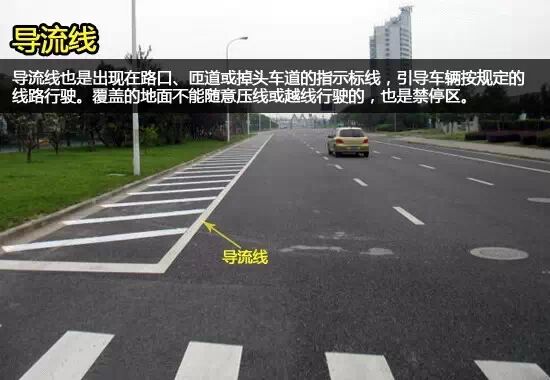 导流线也是出现在路口、匝道或掉头车道的指示标线,引导车辆按规定的线路行驶。但很多驾驶者误以为这是停车区域,其实导流线覆盖的地面是不能随意压线或越线行驶的,也不能在区域内停车。