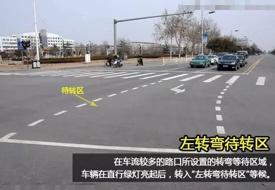 在车道较多,路面情况复杂的交通路口,为了提高机动车通过量,避免交通堵塞,常常会设立左转弯待转区,允许车辆在直行绿灯亮起后,转入“左转弯待转区”等候。