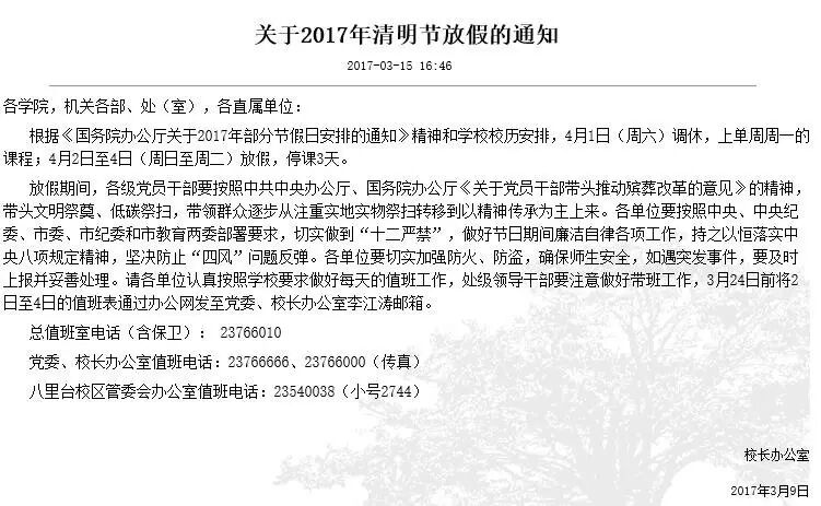 根据《国务院办公厅关于2017年部分节假日安排的通知》精神和学校校历安排: