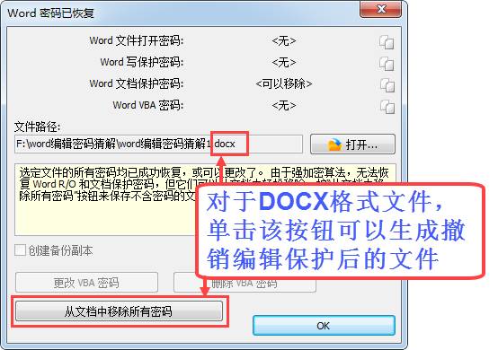 对于DOCX格式文件,可以另存为新文件,并将新文件直接撤销编辑保护。原文件不变。