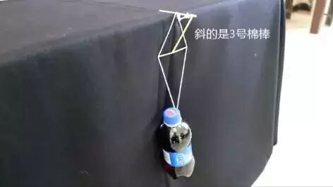 3. 把2号棉棒撑在线之间,3号棉棒的头部抵住1号棉棒的头部,尾部抵在2号棉棒的中间位置,调整好重心,把手慢慢松开,会发现可乐没有掉下来。