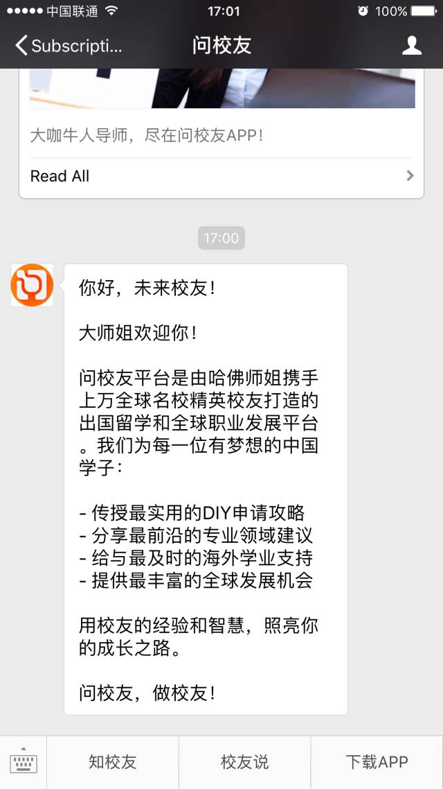 进入问校友官方微信,点击右下角“下载APP”即可直接下载。