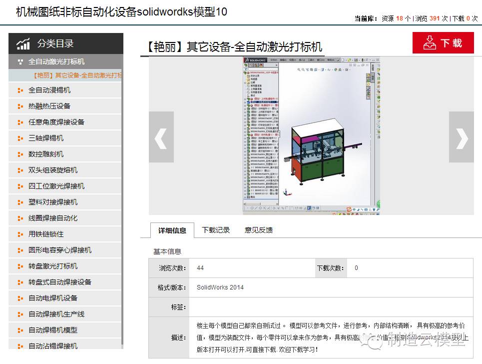 精选18款自动化模型,包含全自动激光打标机、全自动浸锡机、热融热压设备、任意角度焊接设备、三轴焊锡机、数控雕刻机等模型下载。