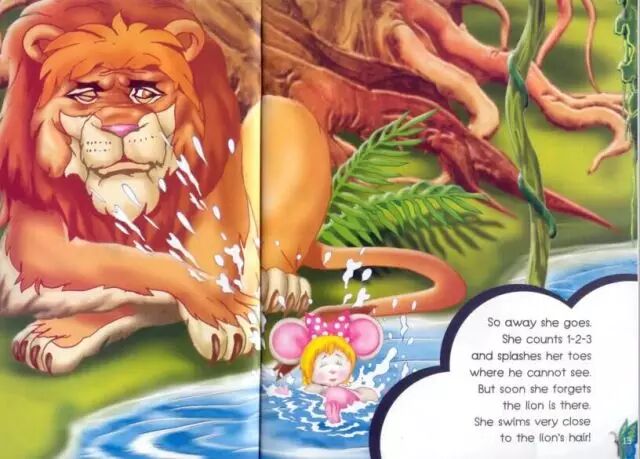 于是,她就走开了。在狮子王看不见的地方,她数着1、2、3,扑通一声跳进了水里。但是很快,她就忘记了狮子还在那里,她游到了离狮子的头发很近的地方。