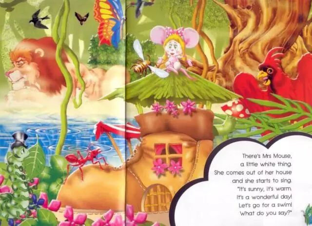 有一只小老鼠,一个白色的小家伙。她从她的房间走出来,并唱起了欢快的歌。