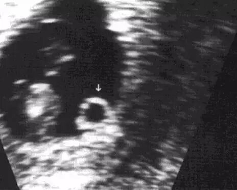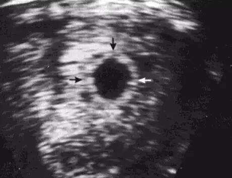 箭头所指为妊娠囊,呈「双环征」,内层为强回声环,外层为低回声环