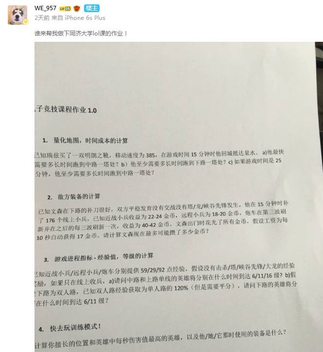 相信之前大家就有听说过电竞已经加入到了教育体系的一部分,而在知名院校“同济大学”的课程里,就有着LOL的身影。而在近日,WE的上单选手957就对该项课程中的作业向众多网友发起求助。