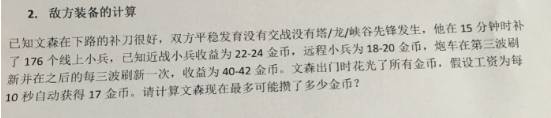 这一题,就助手哥所看,跟上一题的本质还是一样的,还是一道数学题,大家做一做计算就可以得到结果了,不过啊,题目当中好像没有提到野怪,并且问的是最多可能攒了多少钱,(拍黑板)大家算完了补刀记得把野怪的经济加一加哦。