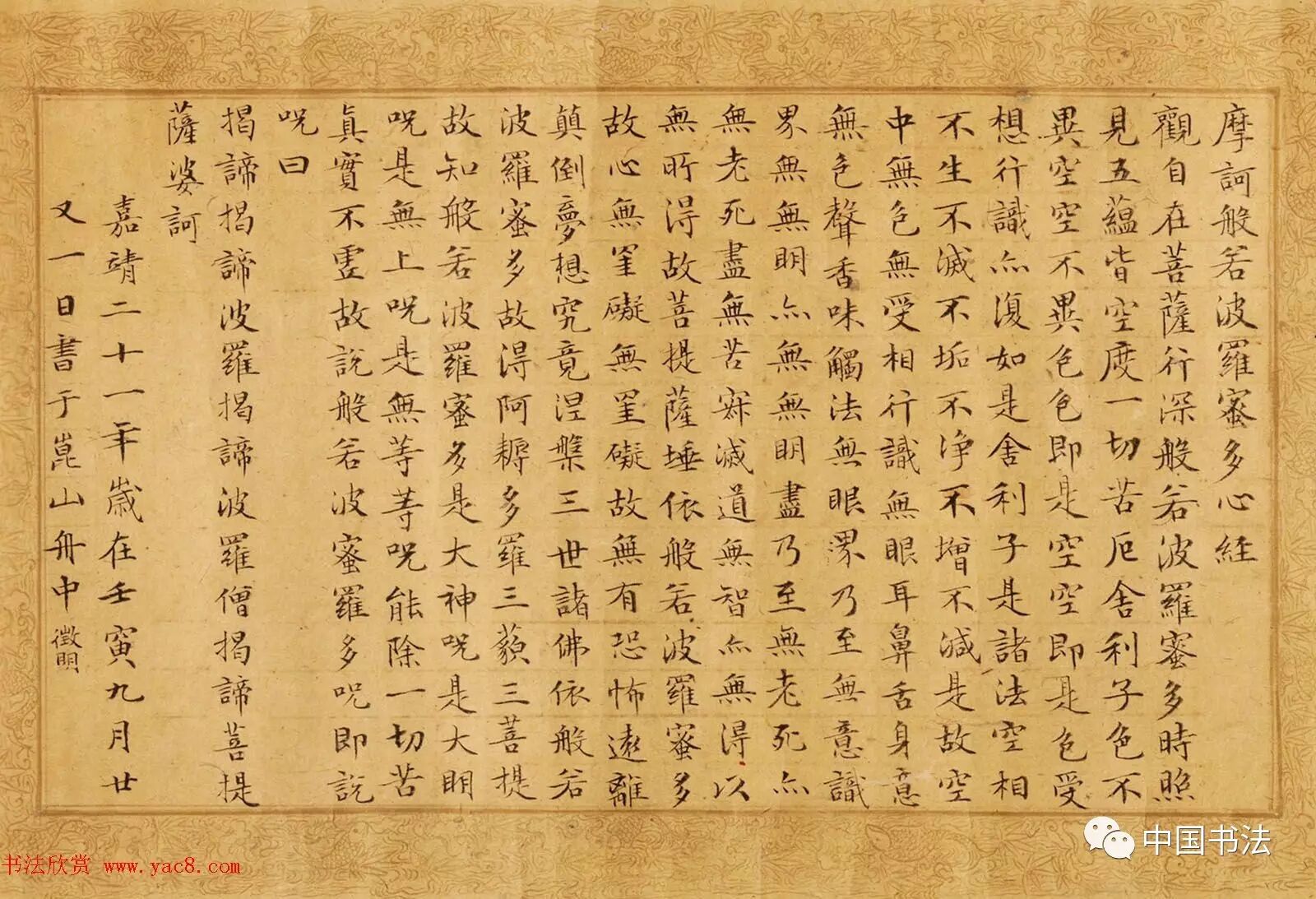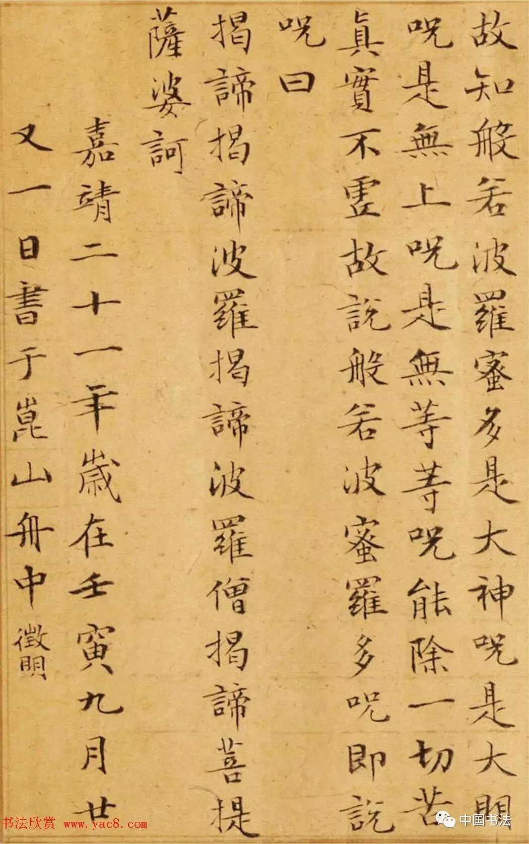 嘉靖二十一年壬寅(1542),文徵明时年七十三岁。往昆山,九月廿一日在舟中为收藏家周凤来小楷《心经》。