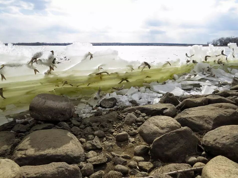 据《赫芬顿邮报》1月18日报道,大学教授凯丽·普瑞亨在美国南达科他州的一自然公园里拍下了湖鱼被水冻结在空中的奇特景象,仿佛是鱼儿跃出水面在空中被冰封住的一样。