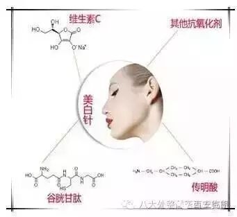 美白针没有固定配方,主要根据求美者的肤质量身定制,用来分解人体肌肤的黑色素、黄色素,补充活化美白因子。市场上的美白针主要成分含谷胱甘肽、氨甲环酸(传明酸)以及维生素C等。谷胱甘肽是很好的抗氧化剂,具有阻止黑色素生成的作用。而传明酸是一种凝血药,被广泛运用于临床止血。