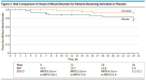 ▲ 预防抑郁发病方面,舍曲林相比于安慰剂的需治数(NNT)为5.9(95% CI, 3.1-71.1; P=0.03)。作为参照,既往研究显示抗惊厥药治疗双相抑郁的汇总NNT为5.06(Vázquez GH,et al. J Affect Disord. 2015 May 19;183:258-262.)。