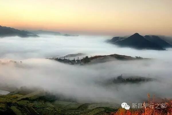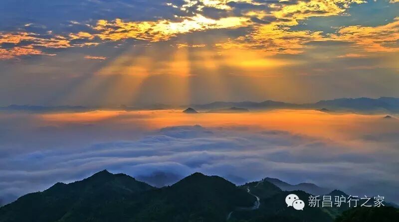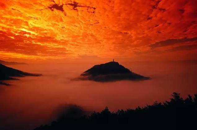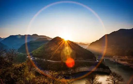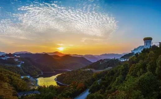 云雾缭绕山腰,霞光笼罩,光彩夺目