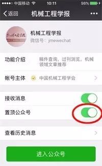 将置顶公众号的按钮(图中画红圈的地方)打开