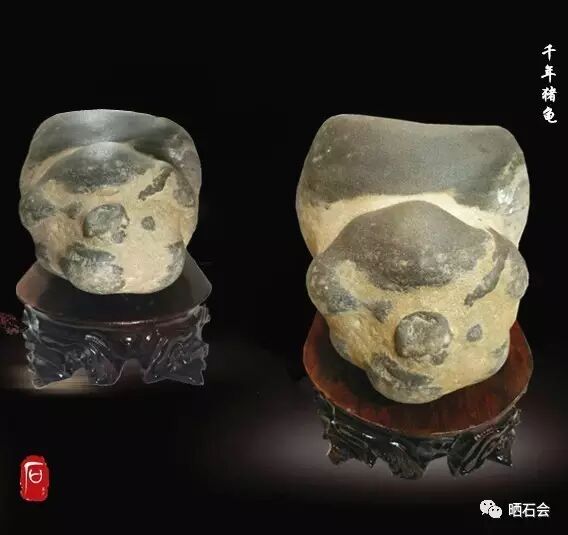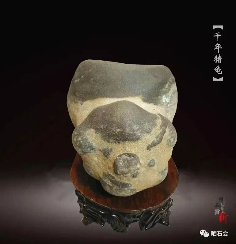 此石“千年龟猪”属天然黄河石原石,产自白云山黄河夹心滩。此石质地光滑细腻,石形前看有像猪,头部五官形象逼真。又如神龟,形神兼备。纹理自然有序、俏色自然。它具备了其形态,质地,色彩,纹理,韵味五味俱佳的惊艳而令人折服,大自然的鬼斧神工将神猪龟形象在此石诠释到了极致,体态惟妙惟肖,韵味十足。