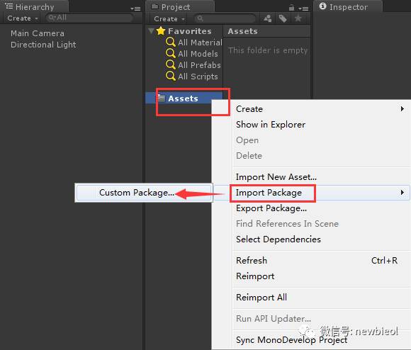 第三:在Project试图中选中Assets鼠标右击->import unitypackage->Custom Package