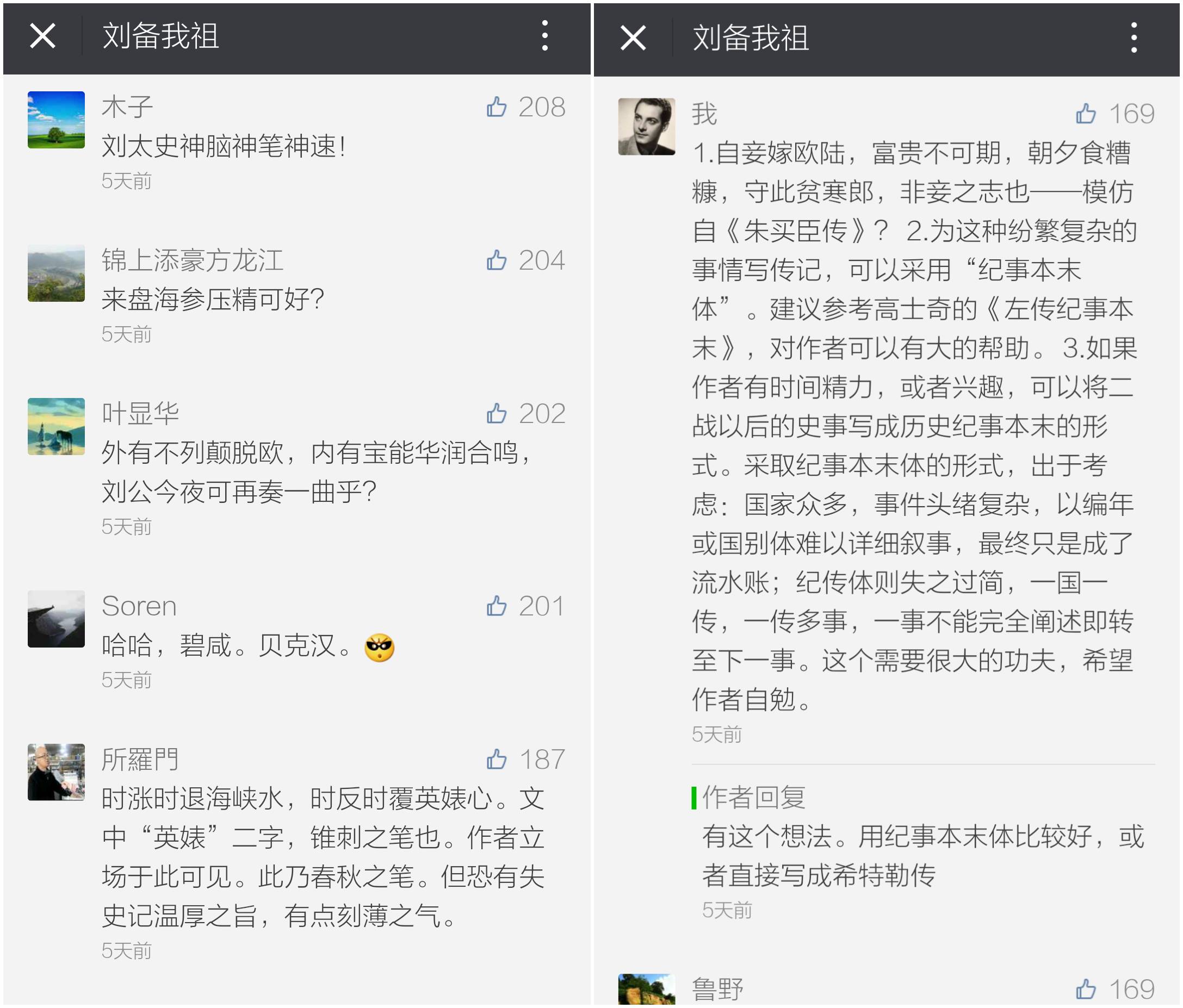 公众号以行业为垂直划分标准已有多时,以文风来分帮派的还鲜有讨论。公众号“刘备我祖”正是公众号生态中以古文表意的典型。刘黎平的“史记”系列文章,又被称为“当代史记”。粉丝在评论中称他为刘公、刘郎亦或太史刘。