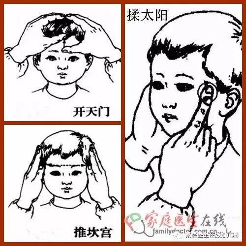 治疗小儿发热的推拿手法主要作用在头、颈、手、背四个部位,分别有推攒竹(开天门)、推坎宫、揉太阳、清天河水、清肺经。偏风寒者可加推三关、拿风池,掐揉二扇门;偏风热者则加推脊、推天河水。